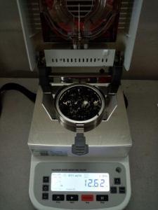 - 測(cè)試種子顆粒1:為了使測(cè)試過(guò)程中種子水分儀將種子烘干烘透,我們將種子分散開(kāi)來(lái),以便溫度能滲透進(jìn)種子內(nèi)部。取5克種子顆粒撒于不銹鋼托盤中,用鑷子將種子顆粒平鋪均勻,為避免種子烘烤后變焦,我們將溫度設(shè)置在135℃,按“START”鍵開(kāi)始測(cè)試,18分49秒后檢測(cè)結(jié)束,檢測(cè)數(shù)據(jù)顯示12.61%;