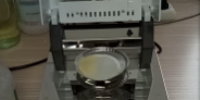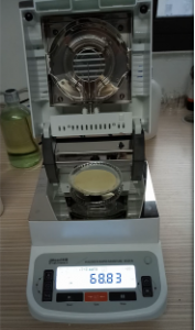 二、儀器本身有個自動降溫過程,為求得數(shù)據(jù)的準確性,故在進行第二次測量的時候先等待幾分鐘,使儀器顯示溫度為40度以下時再進行第二次測量,這次我們加大膠水樣品量為7.025克,將膠水均勻滴于鋁箔盤上,溫度照樣設(shè)定在120℃,按“START”鍵開始進行測試,由于這次的膠水量比較多,所以儀器此次用了17分鐘43秒才測試結(jié)束,測試結(jié)果數(shù)據(jù)顯示31.17%(含水率),按“單位鍵”切換其顯示數(shù)據(jù),則屏幕顯示其固含量為68.83%。