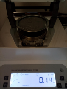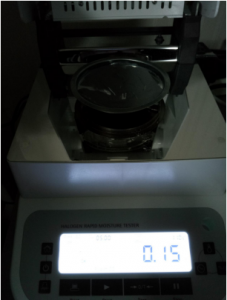 第一次,因樣品3屬金屬粉末,密度較大,取10克樣品3#粉末,置于不銹鋼托盤中,用鑷子將金屬粉末平鋪均勻,溫度設置110℃用儀器進行加熱,定時5分鐘后檢測結(jié)束,檢測數(shù)據(jù)顯示0.15%;