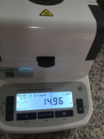 測(cè)試樣品2:為了檢測(cè)儀器的精確性,待儀器溫度降至50℃以下時(shí)進(jìn)行第二次測(cè)試,用實(shí)驗(yàn)勺提取5.5克飼料,置于不銹鋼托盤中,用實(shí)驗(yàn)藥勺將飼料平鋪均勻,溫度設(shè)置135℃用儀器進(jìn)行加熱,約15分鐘后檢測(cè)結(jié)束,檢測(cè)數(shù)據(jù)顯示14.88%;