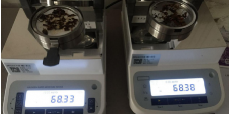 用實驗藥勺提取7.1克醬菜,置于不銹鋼托盤中,用實驗藥勺將面粉平鋪均勻,溫度設(shè)置135℃用儀器進(jìn)行加熱,約6分鐘后檢測結(jié)束,檢測數(shù)據(jù)顯示12.77%;為了檢測儀器的精確性,待儀器溫度降至50℃以下時進(jìn)行第二次測試,用實驗勺提取6.8克醬菜,置于不銹鋼托盤中,用實驗藥勺將醬菜平鋪均勻,溫度設(shè)置150℃用儀器進(jìn)行加熱,約7分鐘后檢測結(jié)束,檢測數(shù)據(jù)顯示12.74%;?用實驗藥勺提取7克醬菜,置于不銹鋼托盤中,用實驗藥勺將醬菜平鋪均勻,溫度設(shè)置150℃用儀器進(jìn)行加熱,約8分鐘后檢測結(jié)束,檢測數(shù)據(jù)顯示12.73%。實驗結(jié)果所得數(shù)值較為準(zhǔn)確,儀器檢測精度較高。