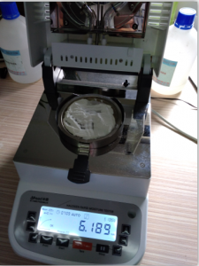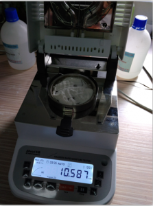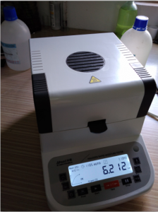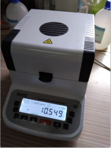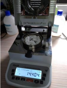 - 測(cè)試混合淀粉:為了使測(cè)試過(guò)程中混合淀粉水分儀將混合淀粉烘干烘透,我們將混合淀粉攤成分散狀,以便溫度能滲透進(jìn)去。取5克左右混合淀粉末置于不銹鋼托盤(pán)中,用鑷子將混合淀粉末平鋪均勻,為避免混合淀粉烘烤后變焦,我們將溫度設(shè)置在135℃,按“START”鍵開(kāi)始測(cè)試,7分55秒后檢測(cè)結(jié)束,檢測(cè)數(shù)據(jù)顯示14.404%;
