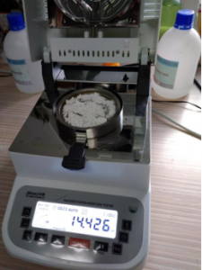 - 為了得到更精確穩(wěn)定的數(shù)據(jù)結(jié)果,在進(jìn)行第二次測(cè)試過(guò)程前先等待混合淀粉水分儀降溫,待儀器本身溫度降至40度以下時(shí),同樣取5克左右混合淀粉末于不銹鋼托盤(pán)中,將混合淀粉末平鋪均勻,這次我們把溫度設(shè)定在135℃,按“START”鍵開(kāi)始測(cè)試,8分23秒后檢測(cè)結(jié)束,檢測(cè)數(shù)據(jù)顯示14.426%;