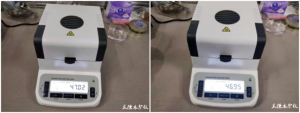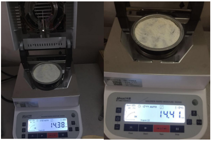 測(cè)試樣品:取5克大米,用粉碎機(jī)打成粉末狀,置于不銹鋼托盤(pán)中平鋪均勻,溫度設(shè)置120℃用儀器進(jìn)行加熱,約12分鐘后檢測(cè)結(jié)束,檢測(cè)數(shù)據(jù)顯示14.38%;
