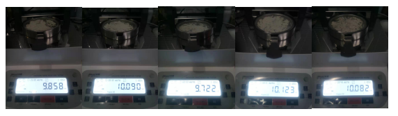 1、測(cè)試陶瓷粉末:為了使測(cè)試過(guò)程中將陶瓷粉末烘干烘透,我們將陶瓷粉末分散開來(lái),以便溫度能滲透進(jìn)陶瓷粉末內(nèi)部。取8克多陶瓷粉末撒于不銹鋼托盤中,用鑷子將陶瓷粉末平鋪均勻,為使陶瓷粉末經(jīng)過(guò)高溫度加熱后能夠徹底烘干,我們將溫度設(shè)置在105℃,按“START”鍵開始測(cè)試,1分鐘37秒后檢測(cè)結(jié)束,檢測(cè)數(shù)據(jù)顯示0.30%;