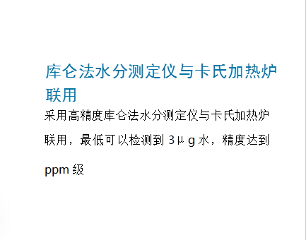 - 采用高精度庫侖法水分測定儀與卡氏加熱爐聯(lián)用,最低可以檢測到3μg水,精度達到ppm級